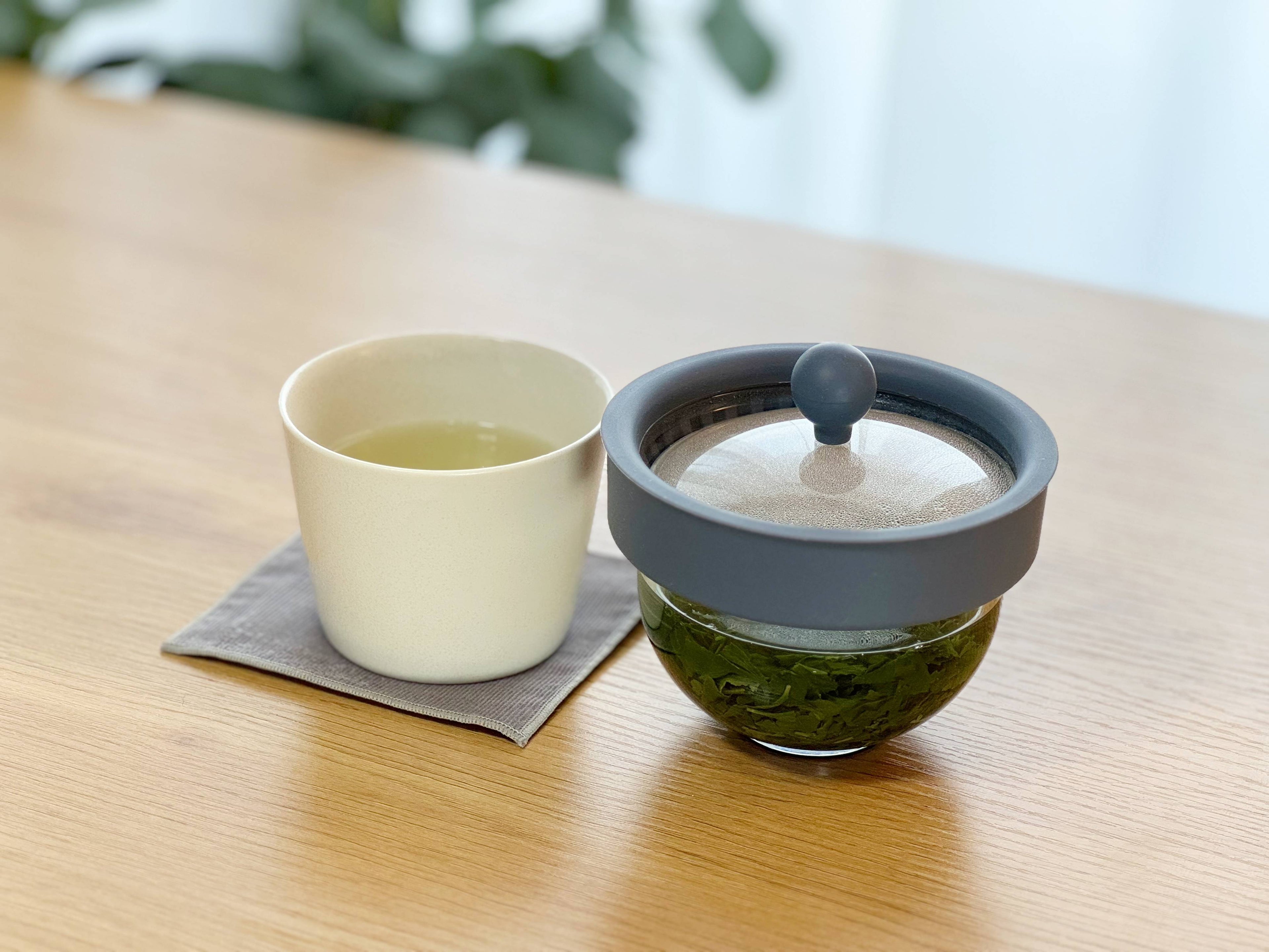 緑茶の場合、投⼊する茶葉は、ティースプーン 1 杯程度をおすすめします。 “少なめ”でも成分が出ます。